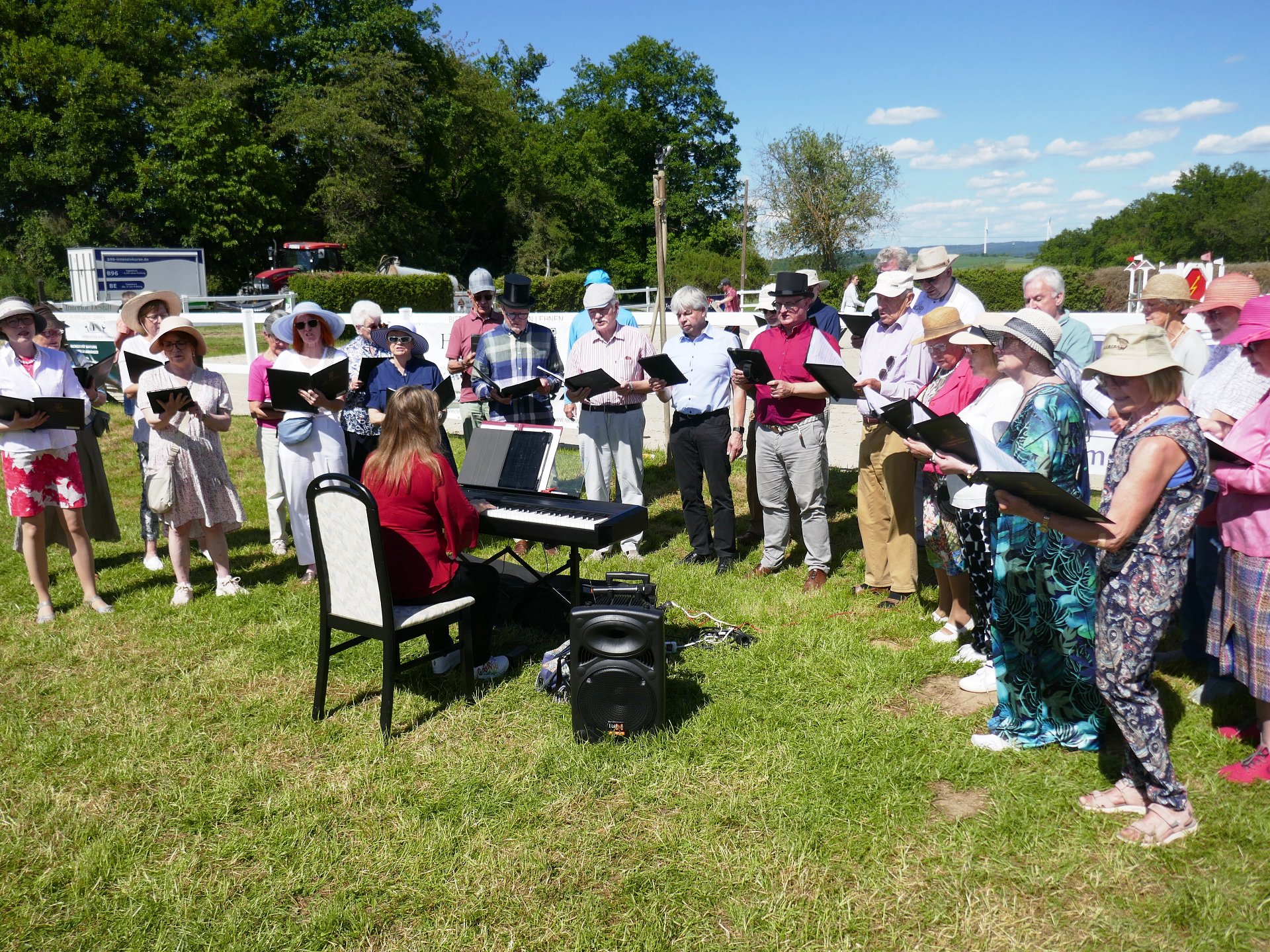 Wie in den Jahren 2022-2024 trat der Gemeinschaftschor gegen 15:00 Uhr wieder beim Springturnier des Reit- und Fahrverein Wallrabenstein auf. Bei erneut schönstem Sommerwetter konnten sich die Anwesenden über fünf vorgetragene Lieder freuen. Nach dem Auftritt gab es für die Chormitglieder eine kostenlose Bewirtung mit reichlich Kaffee und Kuchen.