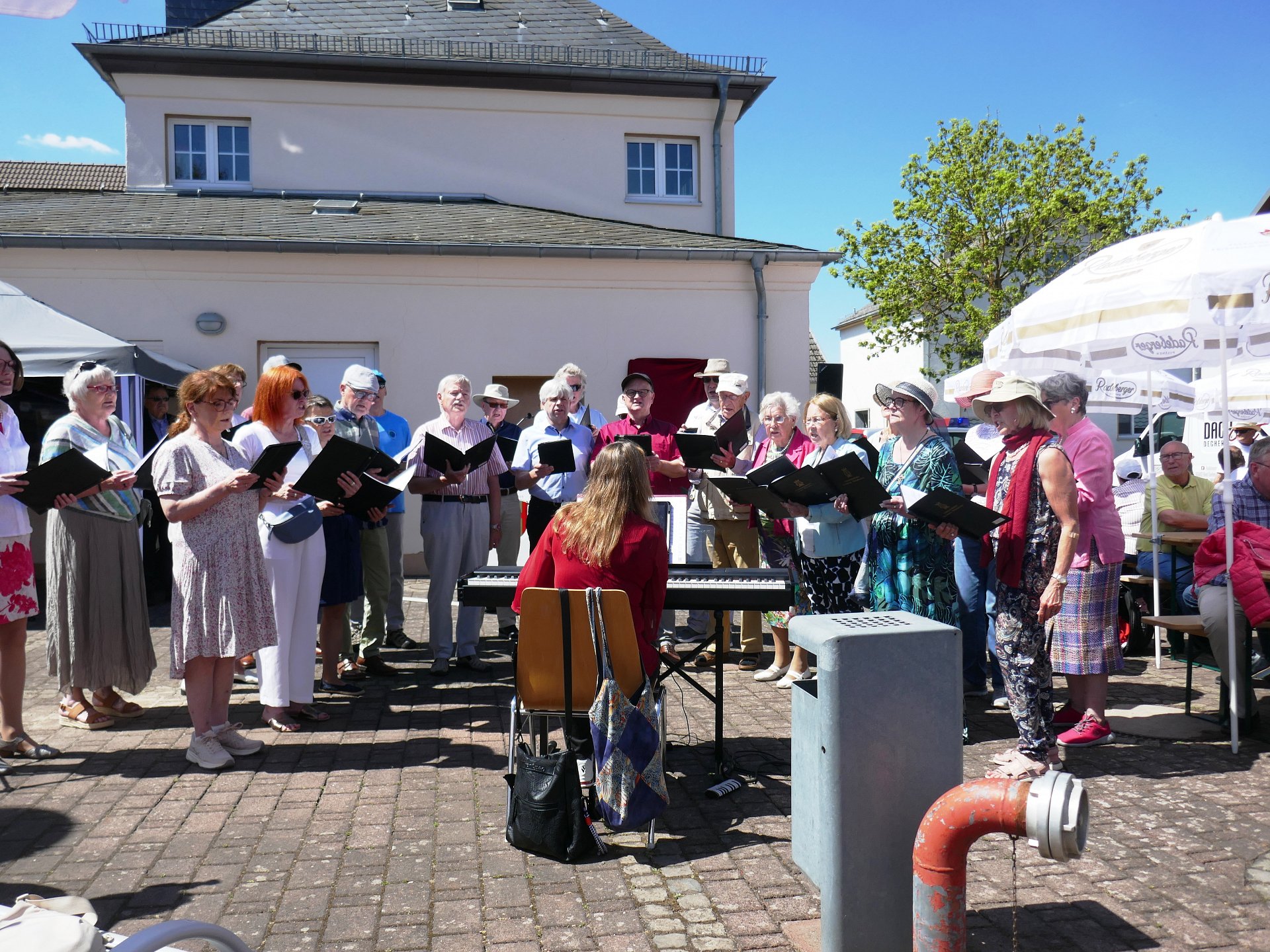 Am Sonntag, den 11.05.2025 sollte um 14:00 Uhr in Hünstetten-Oberlibbach der dortige Rathausplatz nach dem langjährigen Hünstetter Bürgermeister in Helmut Schumann Platz umbenannt werden. Nachdem der Gesangverein Strinz-Trinitatis kurzfristig absagte, bat der Oberlibbacher Ortsvorsteher Jens Rejszer den Gemeinschaftschor Bechtheim-Wallrabenstein um einen Auftritt. Angesichts der Verdienste von Herrn Schumann folgte der Gemeinschaftschor bereitwillig dieser Bitte und eröffnete die Veranstaltung mit vier Liedern. Nach dem Auftritt war leider keine Zeit zum Verweilen, da es gleich anschließend zu einem Auftritt beim Reit- und Fahrverein Wallrabenstein ging.